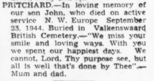 Son of Walter and Elsie May Pritchard, of Coleholm, Shrewsbury, Shropshire.