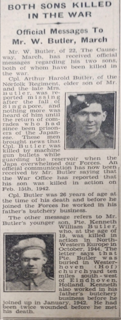 Son of William and Maud Butler, of March, Cambridgeshire.
