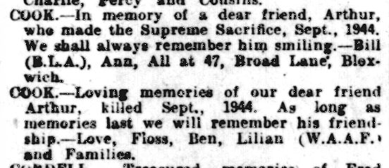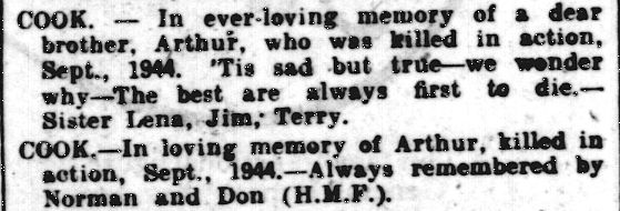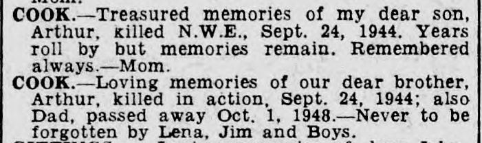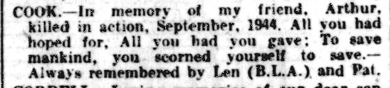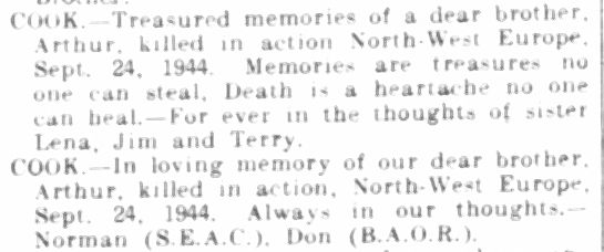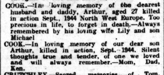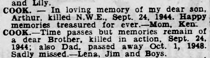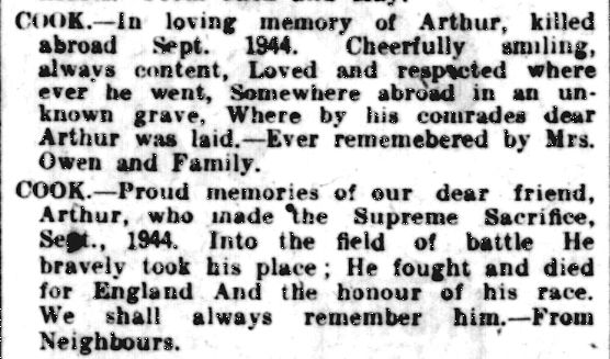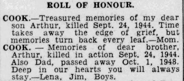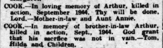 Arthur Meredith Cook was killed in action on 24 September 1944.