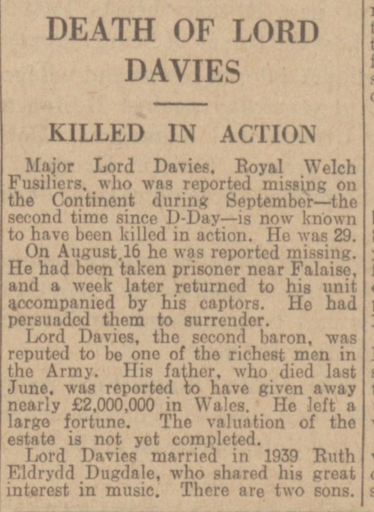 2nd Baron Davies of Llandinam. Son of David Davies, 1st Baron, of Llandinam, and of Mrs. David Davies; husband of Lady (Ruth Eldrydd) Davies, of Llandinam, Montgomeryshire. B.A.